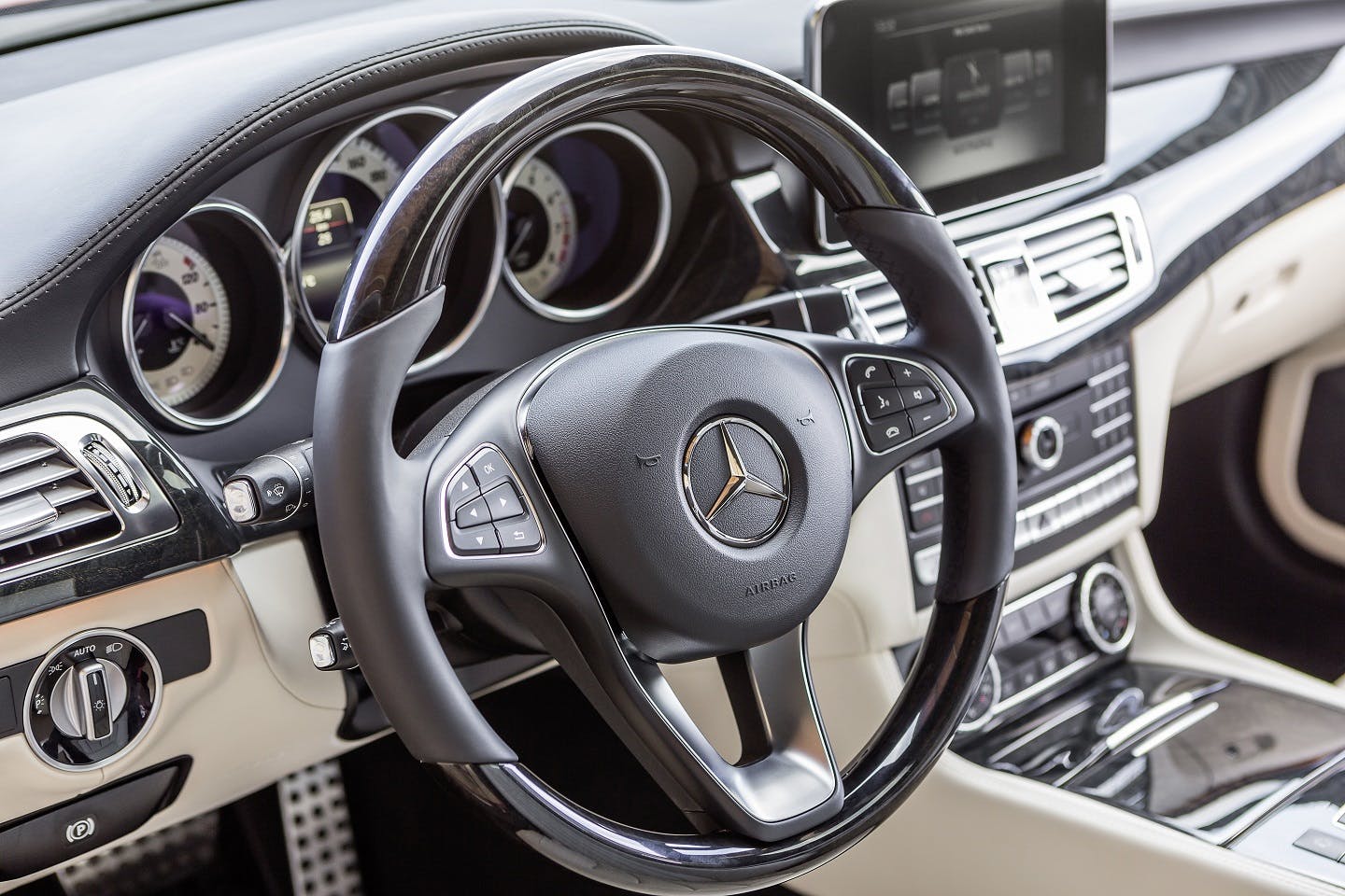 Der Mercedes CLS hat eine gute Grundausstattung, zu der neben dem automatischen Getriebe auch Klimaautomatik, eine teilelektrische Verstellung der Vordersitze und LED-Scheinwerfer gehören. Allerdings gibt es auch kleine Schwächen wie etwa das Fehlen einer Sitzheizung oder einer Bluetooth-Schnittstelle. Gegen Aufpreis sind zahlreiche Assistenzsysteme und Entertainment-Optionen verfügbar. Der Innenraum lässt sich mit Leder und Dekoreinlagen nach dem eigenen Geschmack anpassen – richtig individuell wird es aber erst mit dem hochpreisigen Designo-Programm.
